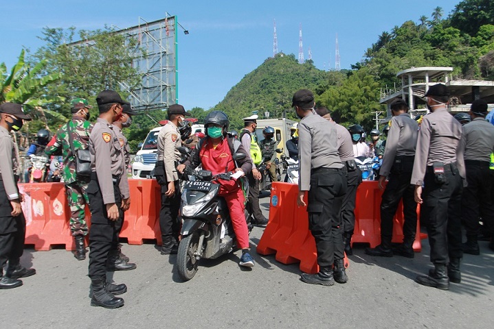 JAYAPURA-Hari pertama pembatasan wilayah, sebanyak 16 titik jalur transportasi darat seputar Kota Jayapura diblokade aparat yang tergabung dalam Gugus Tugas Penanganan Covid-19, Senin (18/4).