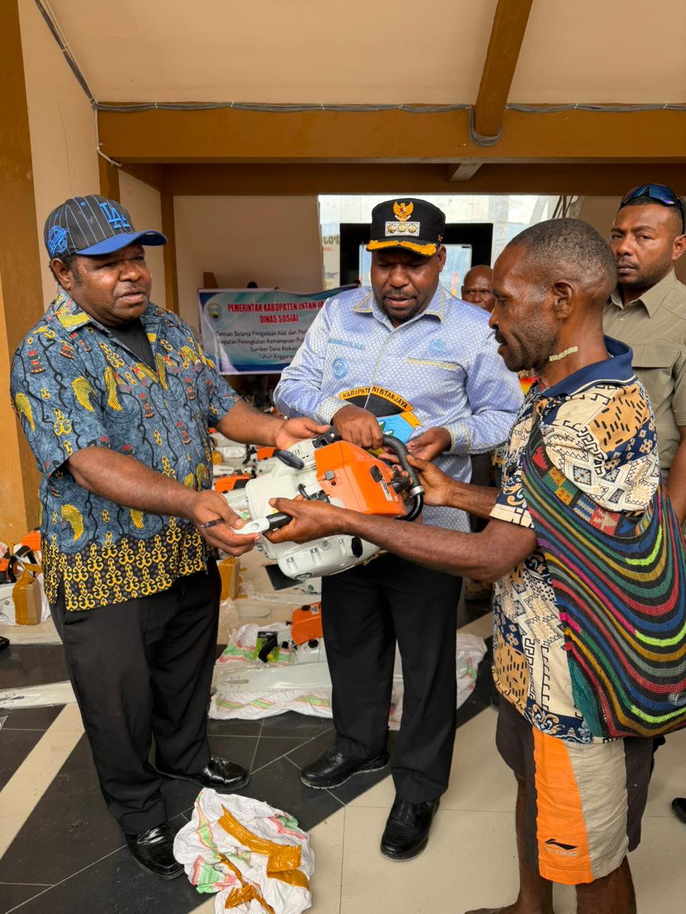 Intan Jaya — Pemerintah Kabupaten Intan Jaya melalui Dinas Sosial menyerahkan bantuan berupa 40 unit mesin sensor dan 80 paket alat pertukangan kepada para tukang lokal, Kamis (13/11). Bantuan tersebut diserahkan secara simbolis oleh Bupati Intan Jaya, Aner Maisini, SH,MH kepada perwakilan penerima manfaat.
