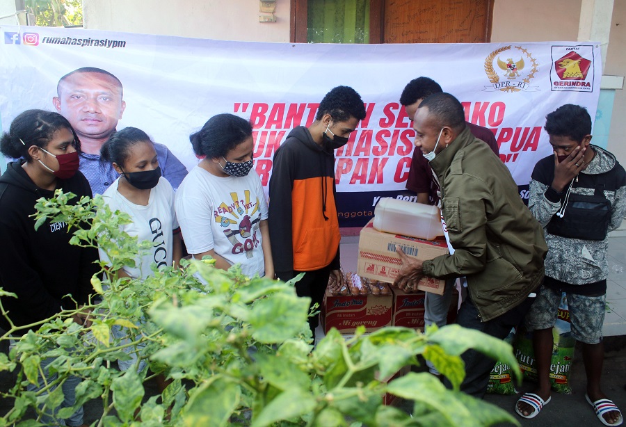 JAYAPURA-Guna memberikan kepedulian dalam aksi kemanusiaan di tengah pandemi Covid-19, anggota DPR RI Fraksi Gerindra dari wilayah pemilihan Papua Yan Permenas Mandenas terus membagikan Sembilan Bahan Pokok (Sembako) ke pelajar dan mahasiswa asal Papua di tujuh (7) kota di Indonesia, Denpasar, Bali menjadi kota kedelapan (8).