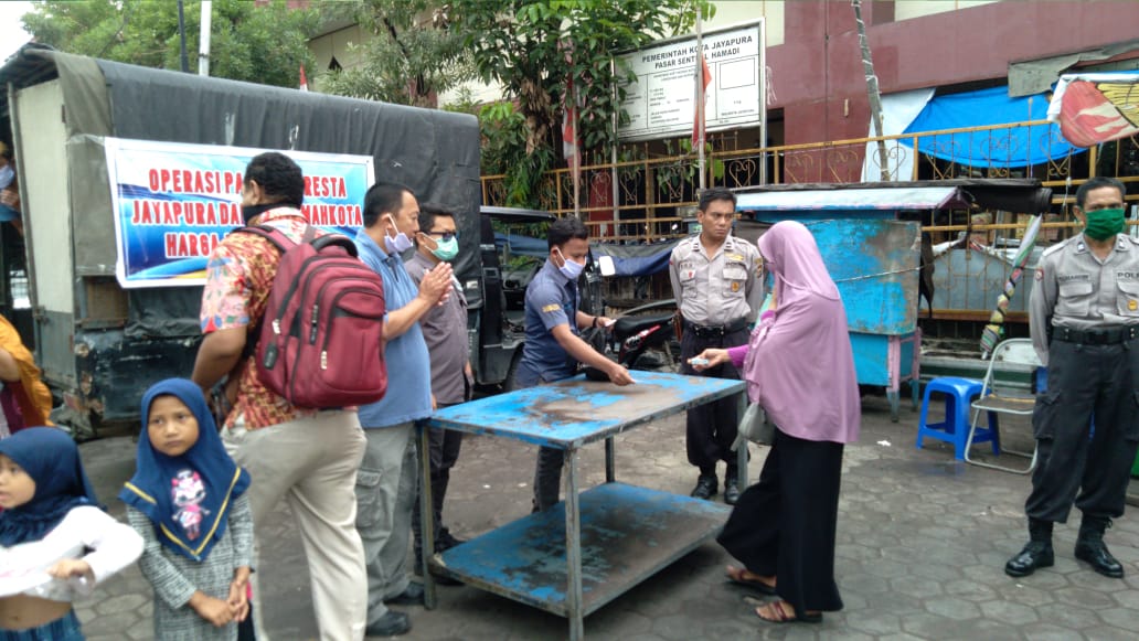 JAYAPURA–Satuan Tugas (Satgas) Pangan Polda Papua memantau langsung aktifitas penjualan Bahan Pokok (Bapok) di Pasar Sentral Hamadi, Distrik Jayapura Selatan, Kota Jayapura, Rabu (8/4).