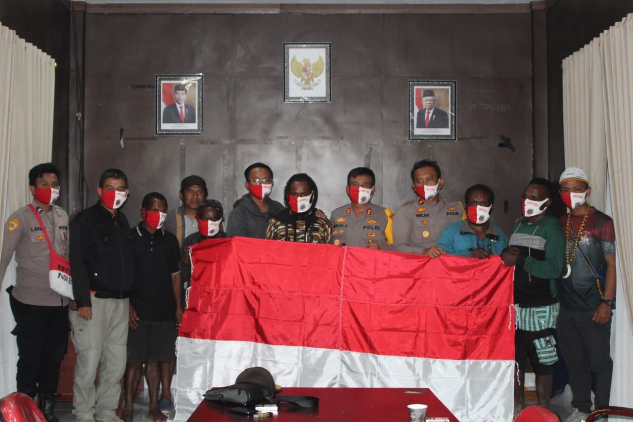 Cari Jalan Telenggen juga membentangkan bendera merah putih saat foto bersama Kapolres Puncak Jaya serta Pemerintah Distrik Gurage.(tambunan)