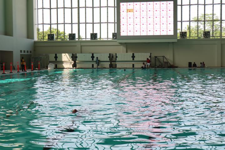 Didalam gedung bersiaplah mata kita dibuat terpukau dengan kolam tanding berukuran 25 m x 51,23 m dengan kedalaman 3 meter (10 baris) serta kolam diving 20 m x 25 m dengan kedalaman 5 meter.
