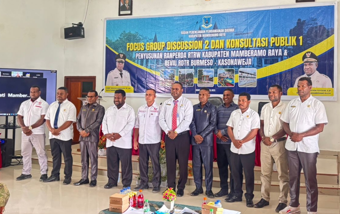 MAMBERAMO RAYA – Badan Perencanaan Pembangunan Daerah (Bappeda) Kabupaten Mamberamo Raya menggelar Focus Group Discussion (FGD) penyusunan Rancangan Peraturan Daerah (Ranperda) Rencana Tata Ruang Wilayah (RTRW) dan reviu Rencana Detail Tata Ruang (RDTR) Burmeso–Kasonaweja, Rabu (27/8) di Aula Bappeda setempat. FGD ini dilaksanakan secara hybrid, offline dan online melalui zoom.