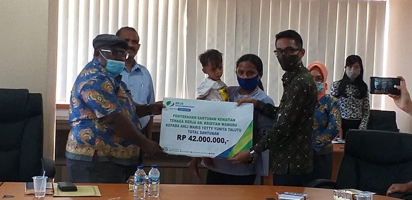 JAYAPURA-Badan Penyelenggara Jaminan Sosial Ketenagakerjaan (BP Jamsostek) menyerahkan klaim santunan Jaminan Kematian (JKM) sebesar Rp 42 juta terhadap ahli waris salah satu peserta BP Jamsostek Papua Jayapura bernama Christian Woruworu.