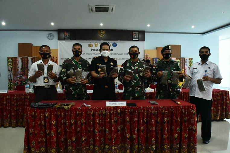 Danrem 172/PWY Brigjen TNI Izak Pangemanan,M.Han, Danlantamal X Laksma TNI Yeheskiel,SE,MM, Kepala Kantor Bea Cukai Albert Simorangkir, Dansatgas Pamtas Yonif Mekanis Raider/413 Bremoro Mayor Infanteri Anggun Wuriyanto,SH,M.Han, Kabid Pemberantasan BNN Papua AKBP Muhammad Safei AB, SE, dan Kasat Narkoba Polres Keerom AKP Sumadiyono saat menunjukan barang bukti ganja hasil sitaan tim gabungan beberapa hari lalu. (Libert/Bintang Papua Online)