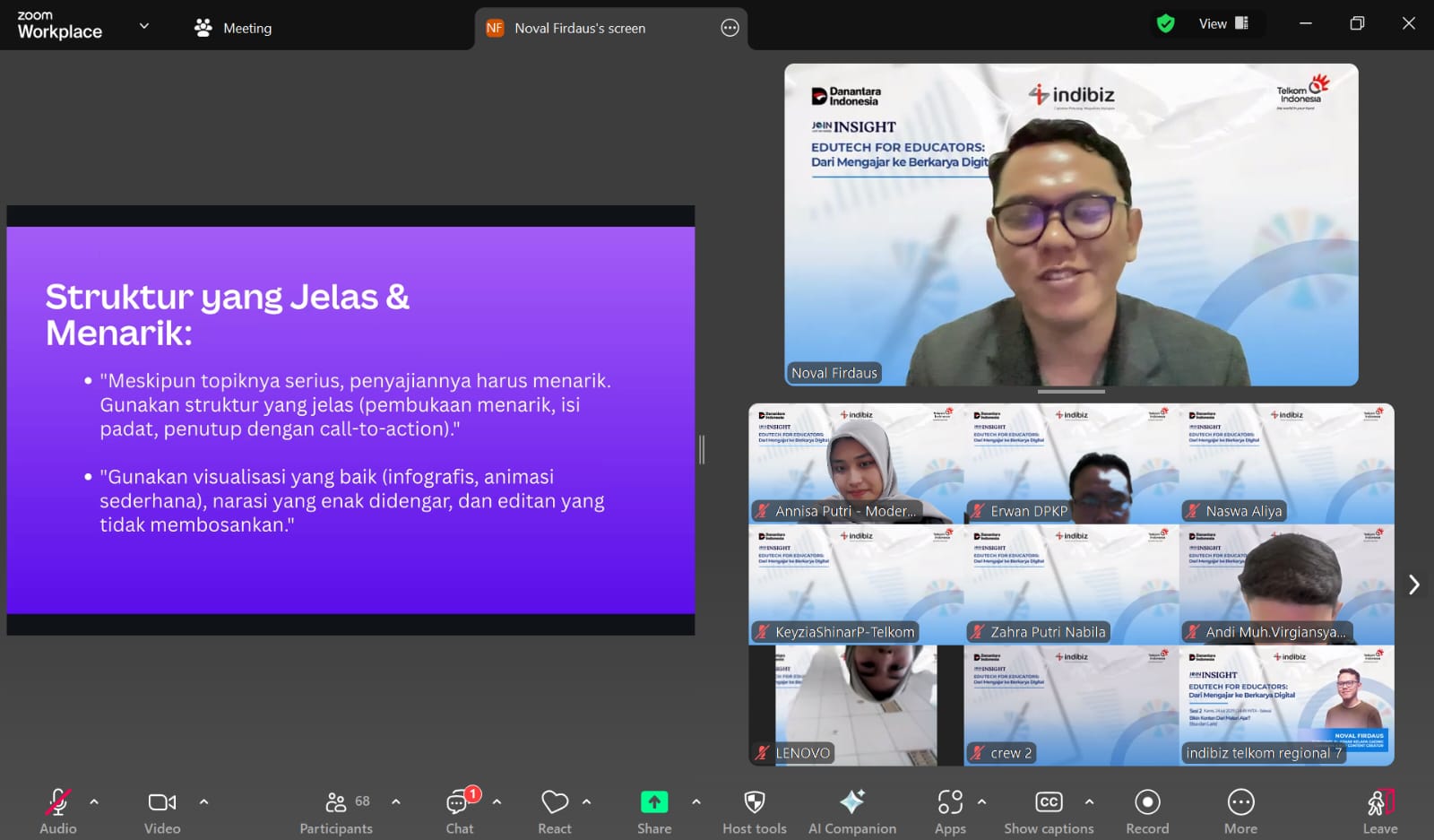 Sesi kedua bertajuk “Bikin Konten dari Materi Ajar? Bisa dan Laris!” membahas lebih dalam tentang peluang monetisasi konten edukasi digital. Noval membagikan strategi dalam membuat konten edukatif yang tidak hanya bermanfaat tetapi juga bernilai ekonomi, seperti e-book, video pendek, microlearning, kelas online, hingga kerja sama brand.