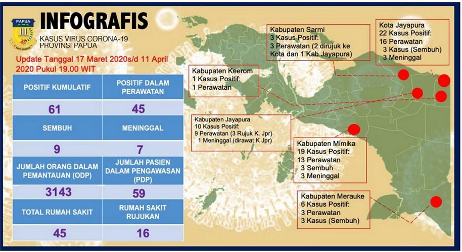 Ia merinci tiap kabupaten yang sudah terinfeksi C-19 diantaranya Kota Jayapura ada 22 pasien positif, 16 pasien perawatan, 3 orang sembuh dan 3 orang meninggal.