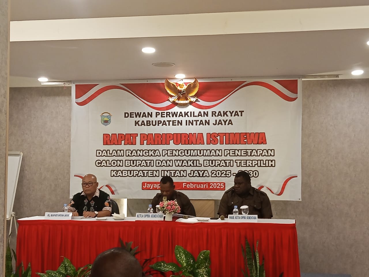 Dalam sidang tersebut, Ketua DPRK sementara Yoseph Tapani mengatakan, penetapan calon bupati dan wakil bupati terpilih kabupaten Intan Jaya periode 2025 – 2030, berdasarkan surat keputusan KPU Intan Jaya nomor 2 tahun 2025 tanggal 06 Februari tentang penetapan pasangan calon bupati dan wakil bupati Intan Jaya terpilih tahun 2024.