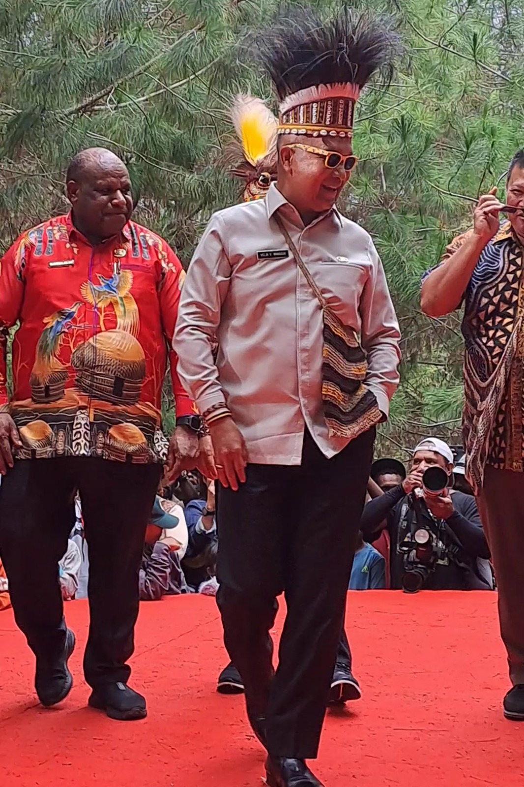 Pj Gubernur Papua Pegunungan, Velix Vernando Wanggai mengajak para pejabat yang hadir diantaranya Staf Ahli Menteri Bidang Inovasi dan Kreatifitas Kemenparekraf RI Restog Krisna Kusuma, Pj. Bupati Jayawijaya Sumule Tumbo, Kepala Balai Besar Kemensos RI Region VI John Mampioper dan forkompinda yang hadir untuk berjalan dan berpose di catwalk Noken Street Fashion.