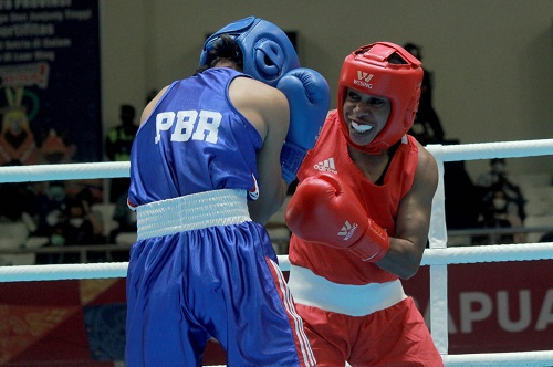 Petinju putri Papua, Selly Wanimbo (merah) lolos ke final tinju PON XX Papua. Tampak Selly saat melawan Silya Muskita dari Papua Barat (biru) di GOR Cenderawasih, Kamis (07/10/2021) (Foto : PB PON XX PAPUA/Husni Oa)
