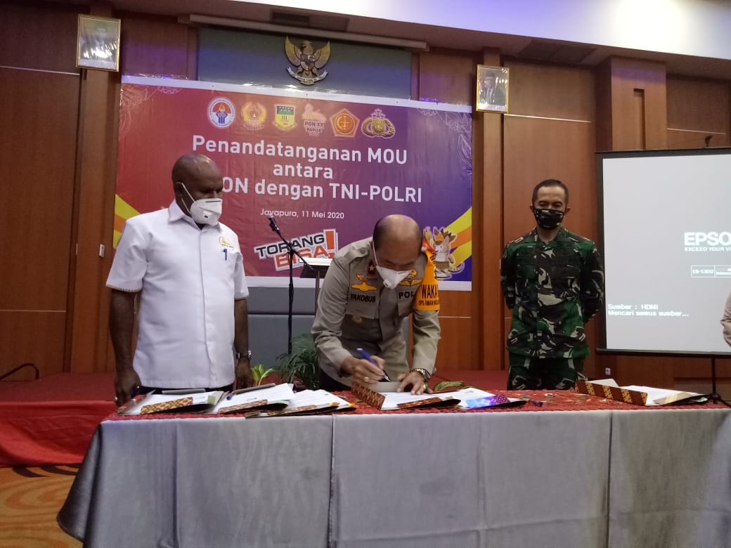 JAYAPURA-Meskipun Pekan Olahraga Nasional (PON) XX Papua resmi ditunda ke September 2021 karena virus Corona yang melanda Tanah Air, namun persiapannya mulai dari infrastruktur hingga akomodasi harus dirancang sejak dini. Terkait dengan itu, Panitia Besar Pekan Olahraga Nasional (PB PON) XX melaksanakan penandatanganan Memorandum of Understanding (MoU) dengan Kodam XVII Cenderawasih dan Polda Papua.