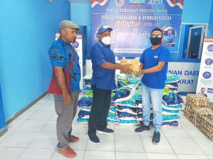 Penasehat Fraksi Demokrat DPR Papua Dr Yunus Wonda,MH saat memberikan bantuan bama ke perwakilan staf DPD Demokrat, Rabu (12/5)