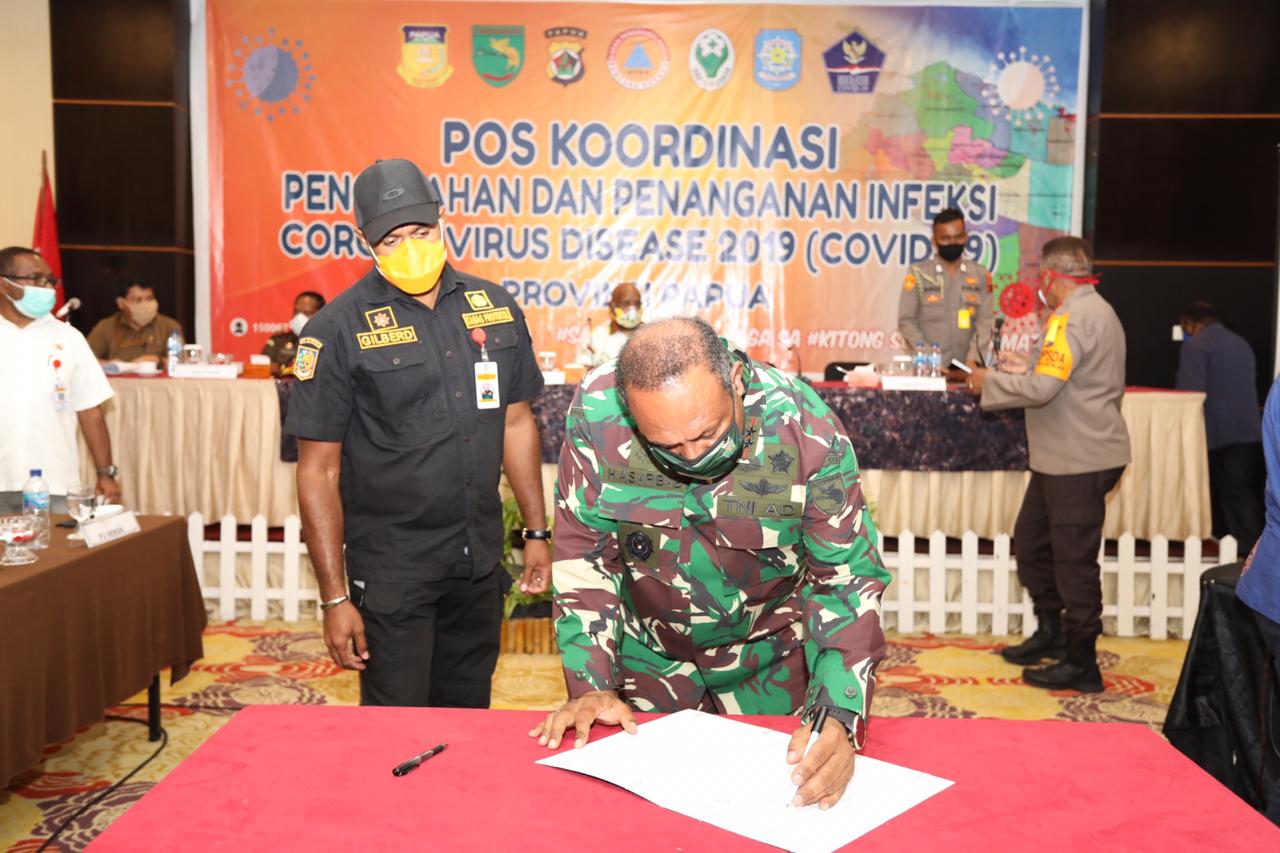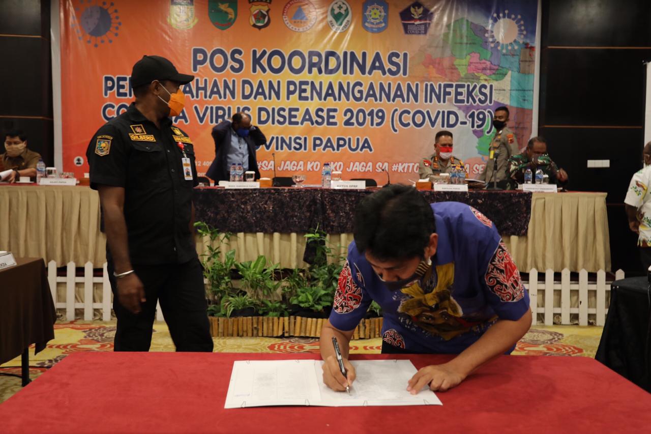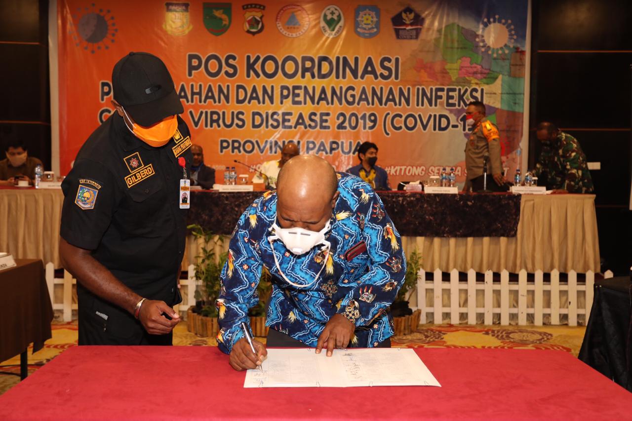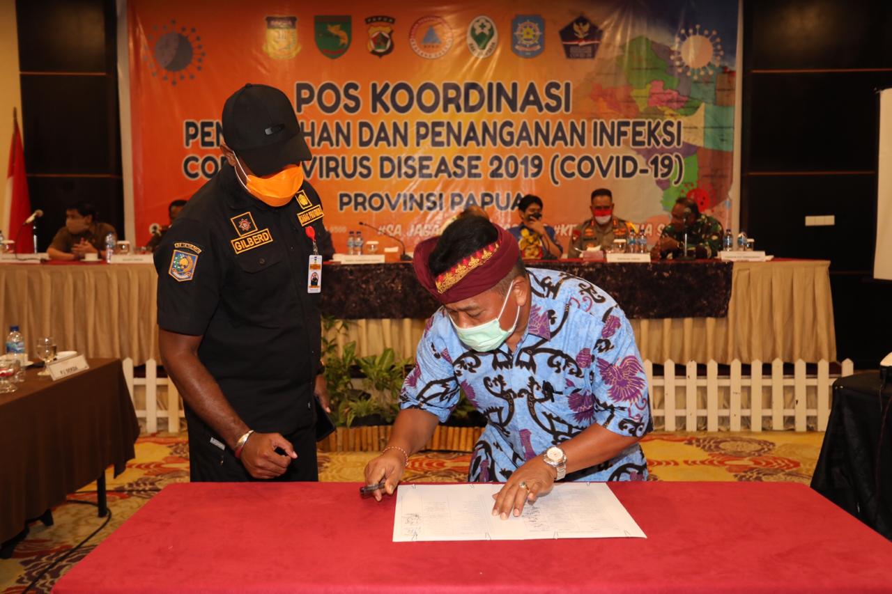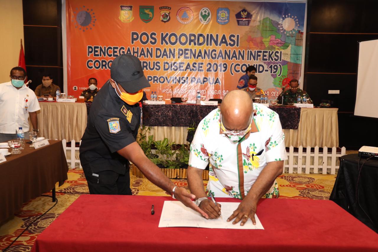 Inilah foto-foto penandatanganan Kesepakatan bersama antara Wakil Gubernur Papua Klemen Tinal dengan Forkopimda tentang pencegahan, pengendalian dan penanggulangan Corona Virus Disease 2019 (Covid 19) di Provinsi Papua, Rabu 03 Juni 2020 pukul 21: 00 Wit di Swisbel Hotel Jayapura.