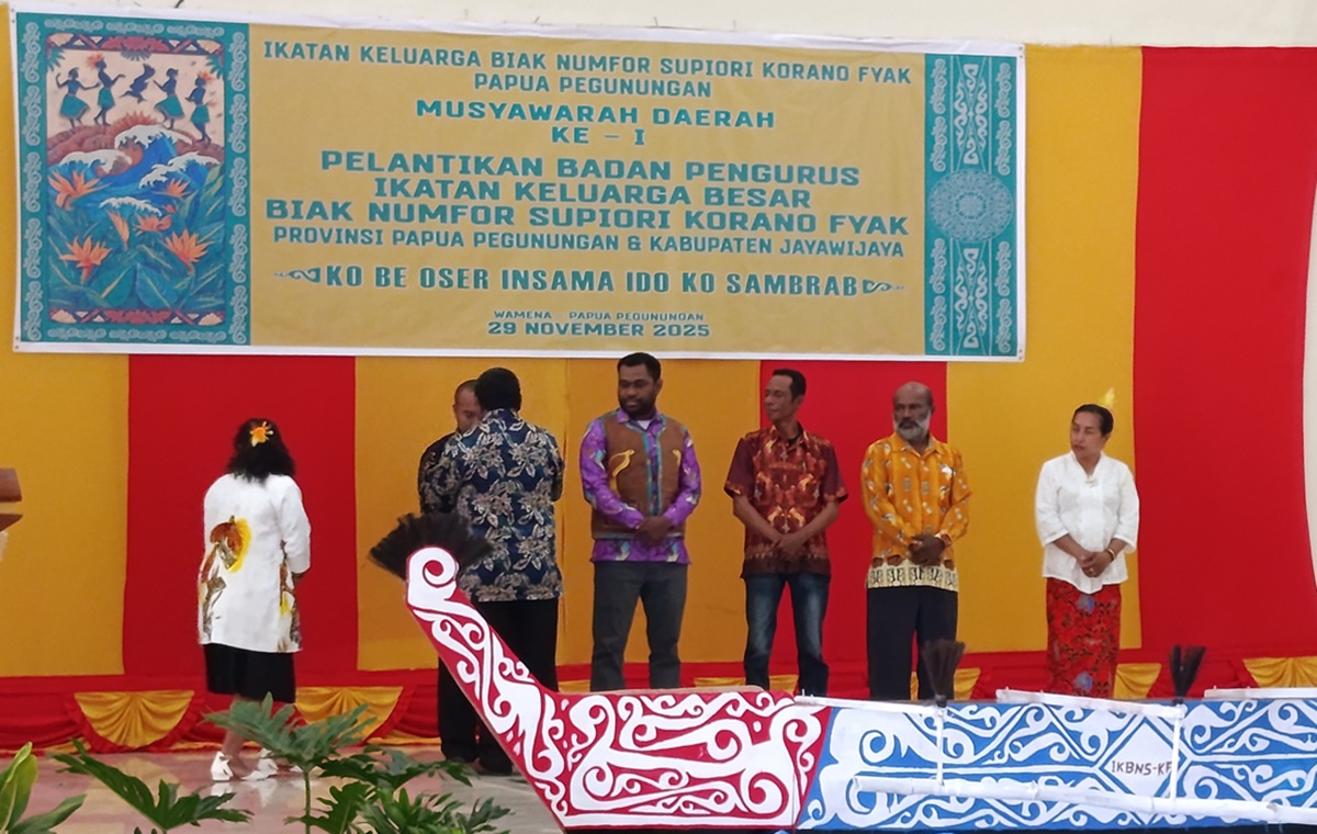 WAMENA-Gubernur Papua Pegunungan John Tabo melalui Kepala Badan Kesatuan Bangsa dan Politik (Bakesbangpol) Papua Pegunungan Agustinus Koway melantik pengurus Ikatan Keluarga Biak Numfor Supiori Korano Fyak (IKBNS-KF) Papua Pegunungan periode 2025-2030.