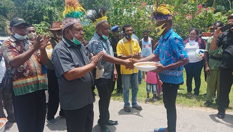 JAYAPURA-Pasangan Calon Bupati dan Calon Wakil Bupati Supiori periode 2020-2025, Yan Imbab dan Nichodemus Ronsumbre mendapat sambutan hangat ketika tiba di Kampung Biniki, Ramardori, Distrik Supiori Selatan, Kabupaten Supiori, Selasa (6/10).