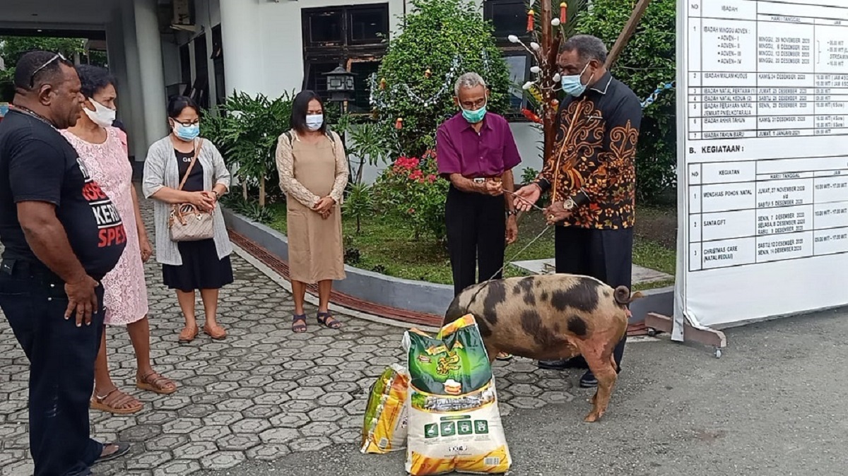 Ketua DRPD Kota Jayapura Abisai Rollo saat menyerahkan satu ekor babi di Greja Imanuel Hamadi, Selasa (22/12/2020).(Istimewa)