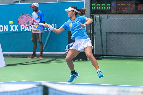 Petenis Tunggal Putri Papua Priska Madelyn Nugroho melawan petenis Putri Jawa Barat babak penyisihan PON XX Papua, di Lapangan Sian Soor Tennis Center Kota Jaypura. Selasa (28/09/2021) (Foto : PB PON XX PAPUA 2021/Silvester)