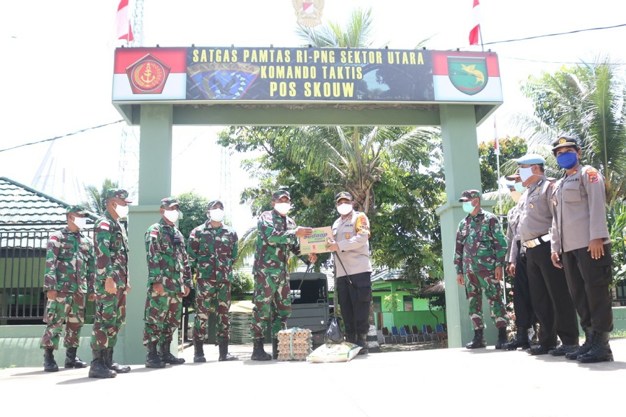 JAYAPURA-Pos Satgas Pamtas RI-PNG dan Pos Polsubsektor Skouw mendapat bantuan Bahan Makanan (Bama) dari Kapolresta Jayapura Kota, AKBP Gustav R Urbinas, Kamis (30/4) siang.