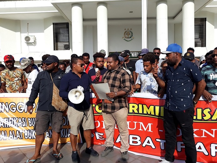 “Patut diduga penetapan tersangka Bupati Waropen oleh Asisten Tindak Pidana Khusus (Alexander Sinuraya,red) tanpa gelar perkara. Kemudian kontroversi angka gratifikasi sejak penyelidikan dan penyidikan dari Rp 42 miliar menjadi Rp 19 miliar,” terang Adnan membacakan tuntutan poin 4 dan 5 dalam demo.