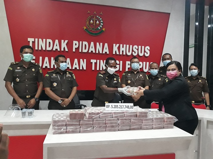 Uang itu telah diserahkan oleh Kepala Kejaksaan Tinggi Papua Nikolaus Kondomo ke pihak Bank Nasional Indonesia, untuk selanjutnya disetor ke kas negara.