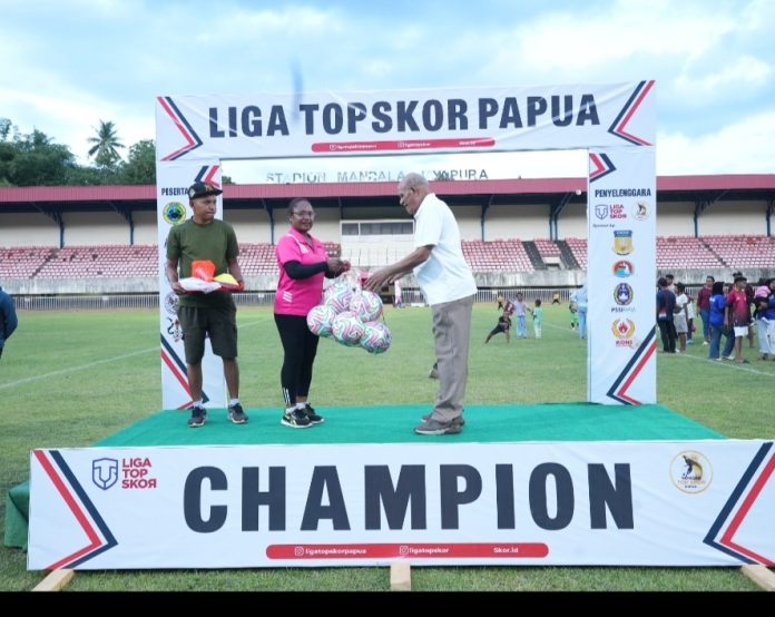 JAYAPURA – Ketua Lembaga Masyarakat Adat (LMA) Port Numbay, George Awi, secara simbolis menyerahkan bantuan berupa 100 unit bola beserta alat pendukung latihan sepak bola lainnya kepada Sekolah Sepak Bola (SSB) di Kota Jayapura. Penyerahan bantuan tersebut dilakukan di Lapangan Mandala Jayapura, Selasa (16/12), bertepatan dengan penutupan Liga Top Score Papua.
