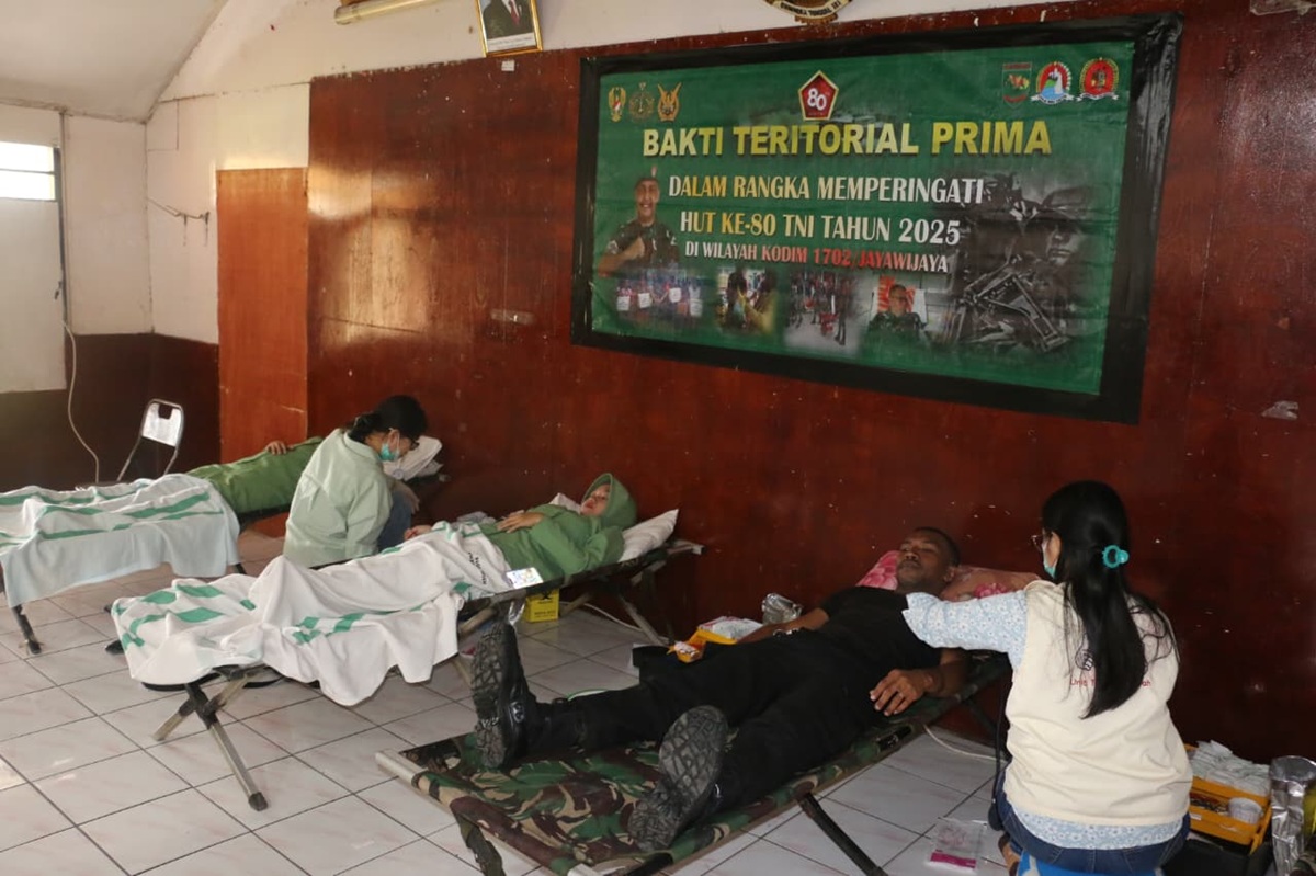 WAMENA-Komando Distrik Militer atau Kodim 1702 Jayawijaya menggelar donor darah menyambut hari ulang tahun (HUT) ke-80 TNI.
