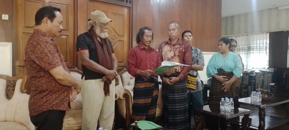 Pernyataan sikap dan dukungan kepada John Manangsang Wally sebagai Calon Bupati Jayapura dan Daniel Mebri sebagai Calon Wakil Bupati Jayapura saat sejumlah orang yang tergabung dalam KPLP NTT Wilayah Kabupaten Jayapura ini menyambangi Kediaman Pribadi Dr. John Manangsang Wally, di Bukit Formokho, Kampung Nendali, Distrik Sentani Timur, Kabupaten Jayapura, Papua, Kamis, 19 September 2024.