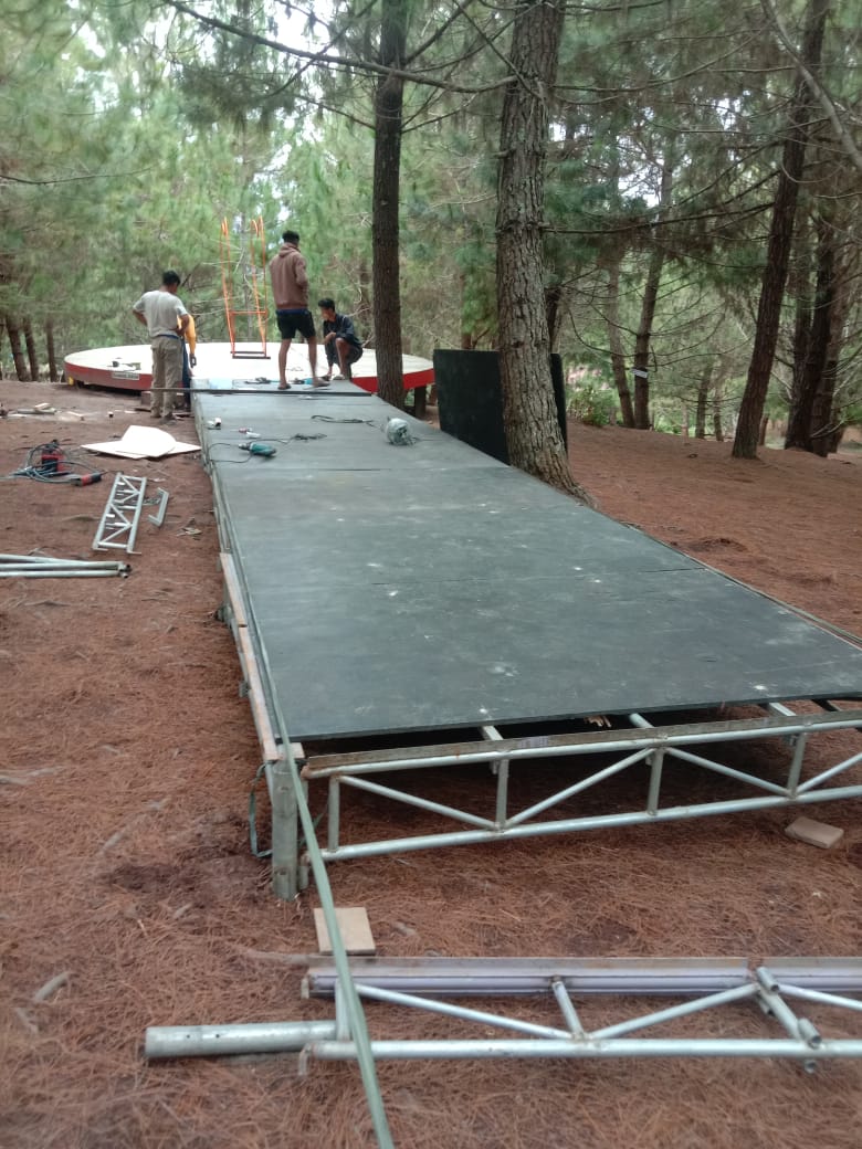 Sementara dibagian depan, panitia sedang membangun gapura dan memasang baliho ucapan selamat datang untuk menyambut para tamu yang hadir.