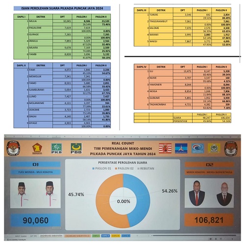 Miko – Mendi sementara unggul di Pilkada Puncak Jaya, dengan perolehan suara 56,26 Persen