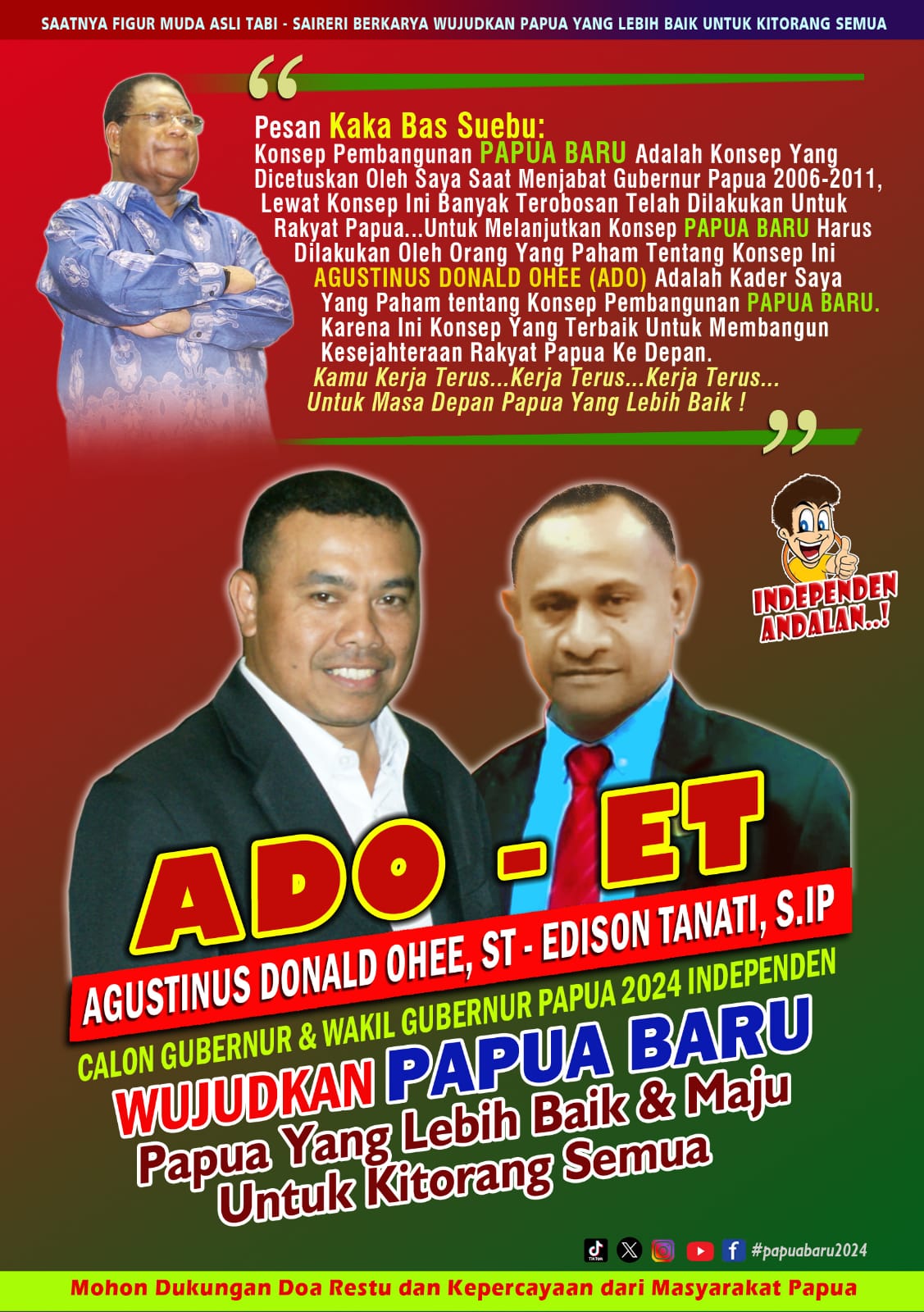 JAYAPURA- Pasangan bakal calon gubernur dan wakil gubernur Papua dari jalur independen Agustinus Donal Ohee,ST (ADO) dan Edison Tanati, S.IP, semakin memantapkan diri maju di Pilgub Papua.