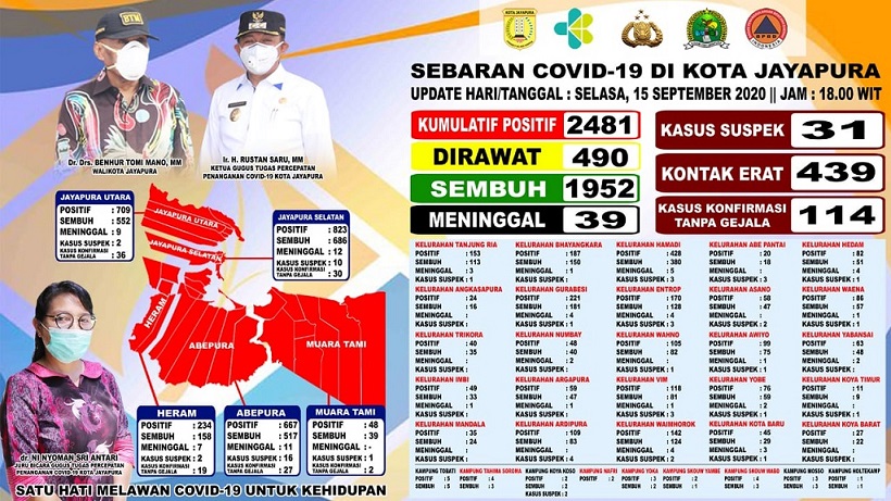 Demikian disampaikan Juru Bicara Gugus Tugas Penanganan Covid-19 Kota Jayapura, dr. Ni Nyoman Sri Antasari, Selasa (15/9) malam.