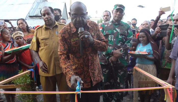 Pjs Bupati Yahukimo saat menggunting pita meresmikan gedung sekolah Minggu Jemaat Imanuel Dekai.(Ruland Kabak/Bintang Papua Online)
