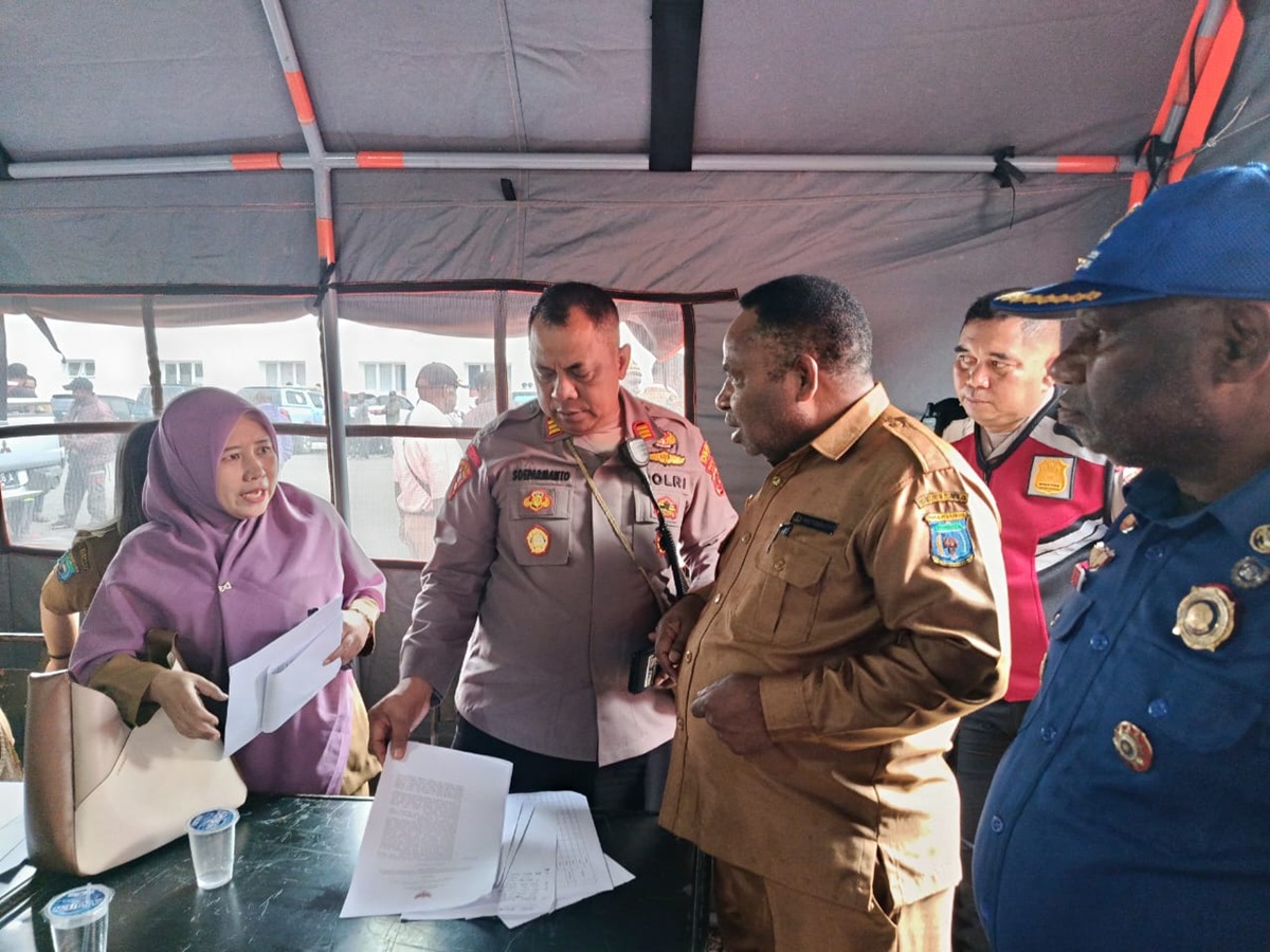 Kepala Dinas Kebakaran, Penyelamatan, Penanggulangan Bencana dan Satuan Polisi Pamong Praja Yanius Y Telenggen bersama beberapa stafnya mengunjungi posko satgas tanggap darurat bencana banjir dan longsor di Kabupaten Jayawijaya pada Selasa (29/4) 2025.
