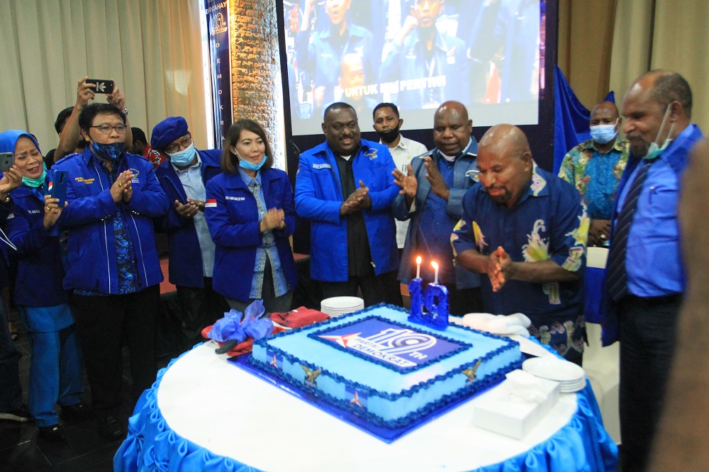 Tak lupa Enembe mengucapkan selamat ulang tahun ke-71 kepada Susilo Bambang Yudhoyono selaku Pembina Partai Demokrat, tepat di hari jadi yang ke-19.(tambunan)