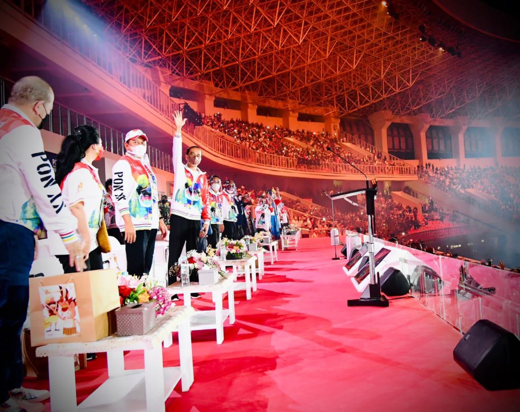 JAYAPURA-Upacara pembukaan Pekan Olahraga Nasional (PON) XX di Stadion Utama Lukas Enembe, kompleks olahraga Kampung Harapan Sentani, Kabupaten Jayapura, berlangsung meriah, Sabtu (2/10).