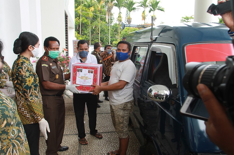 Sebanyak 252 paket bahan makanan pokok (Bapok) dibagikan kepada para sopir dan sejumlah pengemudi ojek online. Penyerahan Bapok ini dipimpin langsung Kepala Kejaksaan Tinggi Papua, Nikolaus Kondomo di halaman kantornya, Selasa (5/5).