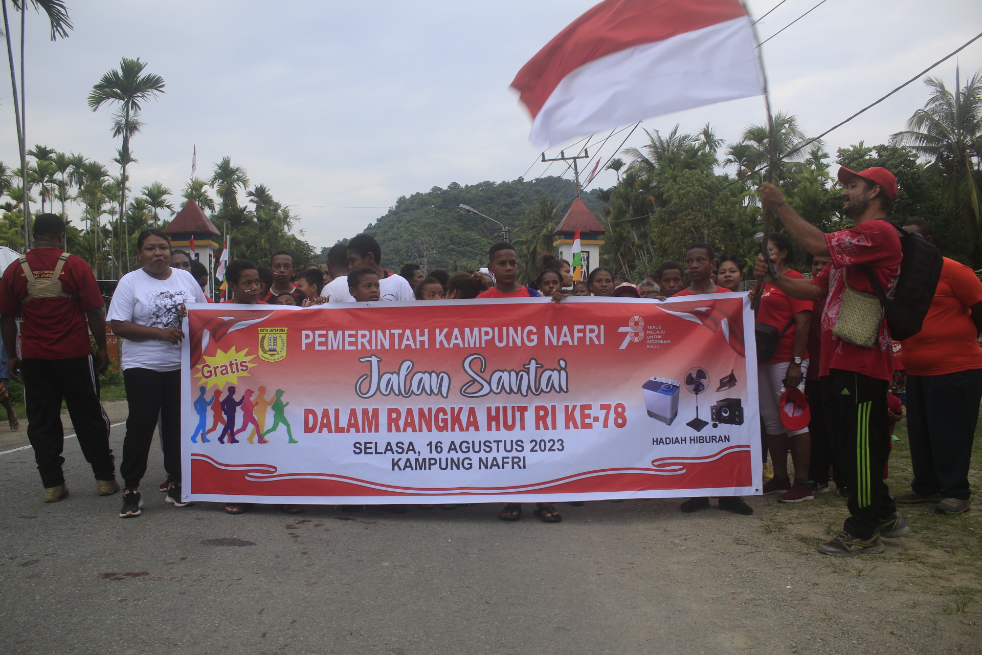 JAYAPURA-Pemerintah Kampung Nafri menggelar jalan santai dalam menyambut Hari Ulang Tahun (HUT) ke-78 Kemerdekaan RI pada Agustus 2023, Rabu (16/8) 2023. Jalan santai dilepas oleh Kepala Kampung Nafri Yohan Merahabia.
