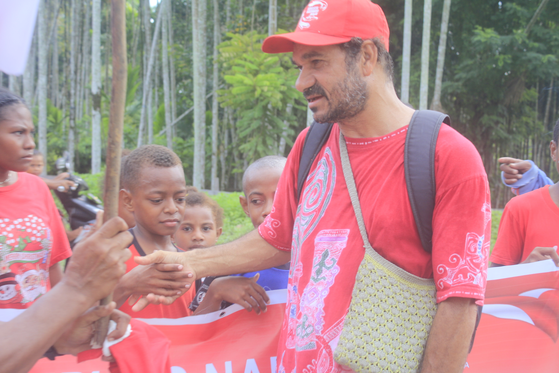 Kepala Kampung Nafri Yohan Merahabia bersalaman dengan anak-anak, peserta jalan santai dalam menyambut HUT ke-78 Kemerdekaan RI pada tahun ini.(Iko Uwais/Bintang Papua)i