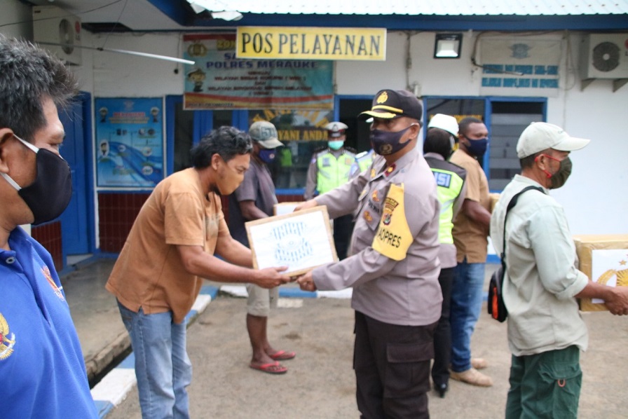 Waka Polres Merauke, Kompol YS Kadang,S.Sos mewakili Kapolres Merauke, AKBP Ary Purwanto,SIK yang langsung memberikan bantuan sosial tersebut. Namun, mengingat saat ini masih dalam situasi pandemik covid-19, sehingga pembagian Sembako tersebut dibagikan secara simbolis ke perwakilan pengemudi Gojek dan sopir angkot.