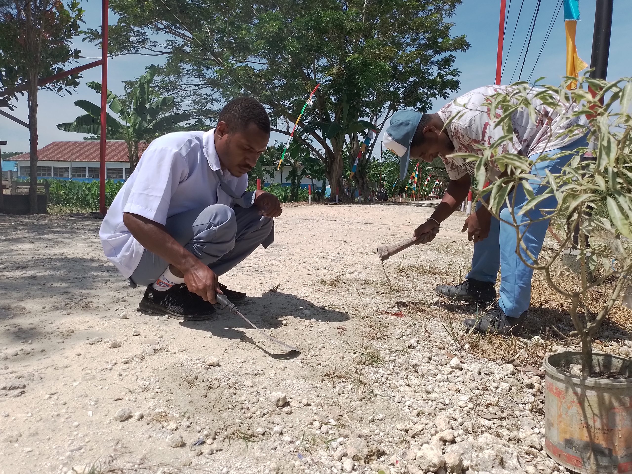KEEROM-Guna mensukseskan Hari Ulang Tahun (HUT) Kemerdekaan Republik Indonesia (RI) ke-77 di lingkungan RT 18/RW 006, Kompleks Pecahan KK, Kampung Sanggaria, Arso 1, Distrik Arso Barat, Kabupaten Keerom, siswa SMK YPK Betlehem membantu membersihkan lingkungan.
