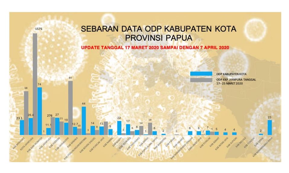Update 7 April 2020, dari Satgas Covid 19 Papua menujukkan jumlah kumulatif pasien positif sebanyak 31 orang, dalam perawatan 22, sembuh 5 orang, meninggal 4 orang dan 3256 ODP serta 44 orang dalam pengawasan tim surveilance tim Satgas Covid-19 Papua.