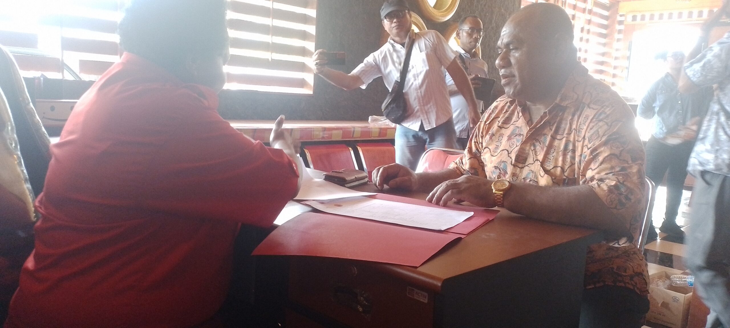 Kedatangan Ted Y Mokay bersama tim diterima langsung oleh Ketua Badan Pemenangan Pemilu (Bappilu) DPC PDI Perjuangan Kabupaten Jayapura, Ismail Mambi.