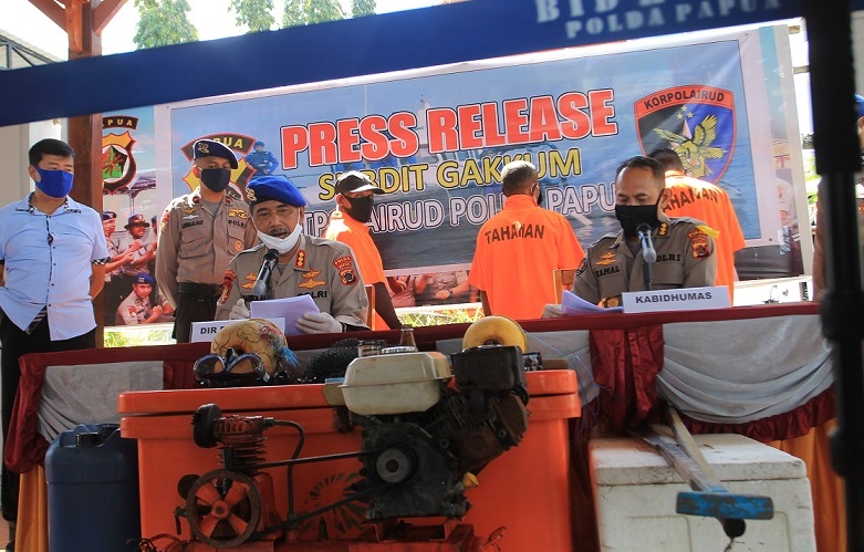 Direktur Pol Airud Polda Papua, Kombes Pol Kasmolan saat merilis ketiga pelaku, menyebutkan, penangkapan bermula dari laporan warga yang menyampaikan adanya aktifitas pengeboman ikan di pantai Base-G.