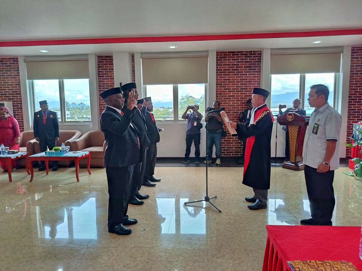 Ketua Pengadilan Negeri Wamena YM Hirmawan Agung Wicaksono melantik tiga pimpinan DPRD Kabupaten Lanny Jaya definitif di antaranya Riswan Kogoya sebagai ketua, Wim Kogoya sebagai wakil ketua I dan Oronius Yigibalom sebagai wakil ketua II yang berlangsung di Wamena, Kabupaten Lanny Jaya, Papua Pegunungan.