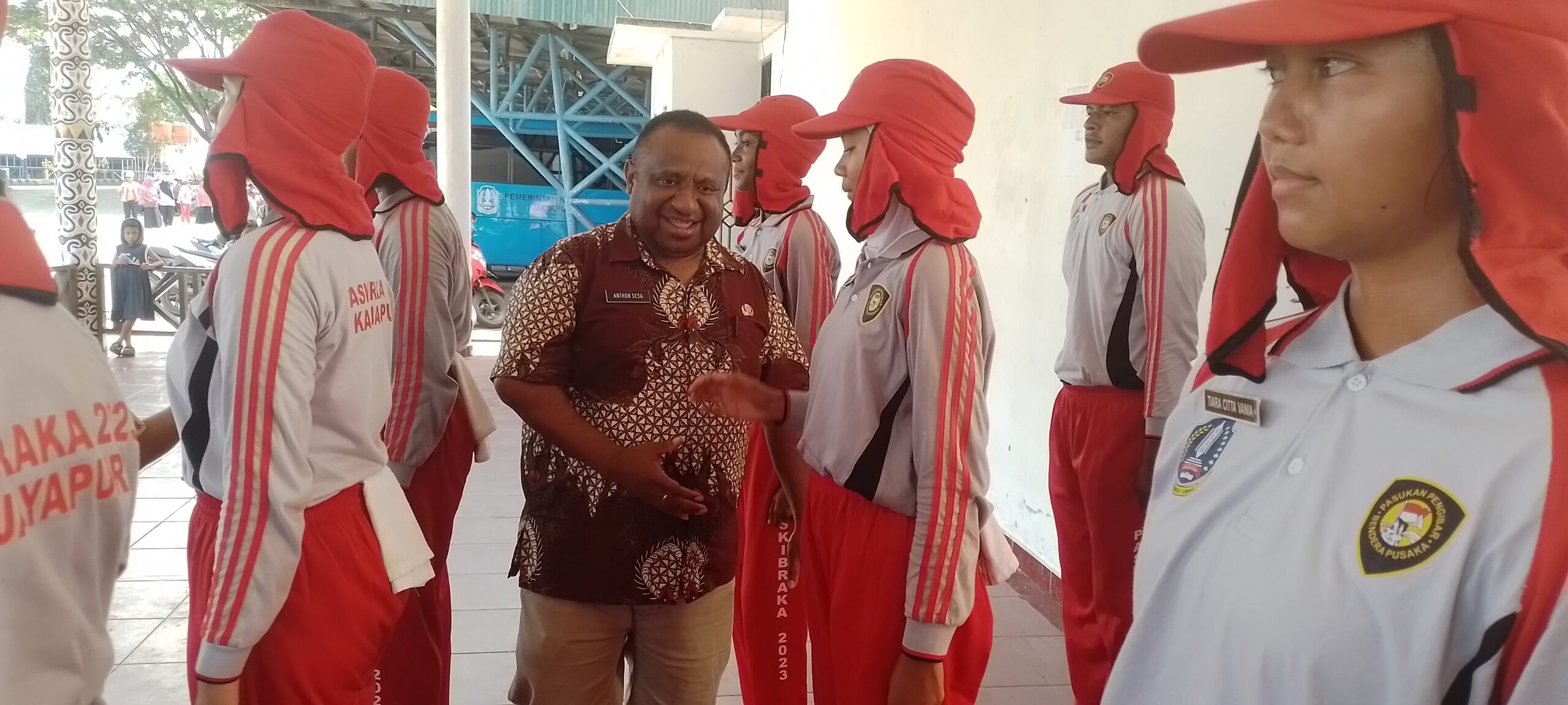 Sekretaris Dispora Kabupaten Jayapura Anthon Sesa didampingi stafnya membagikan perlengkapan latihan serta bersalaman dengan 30 anggota Paskibra tingkat Kabupaten Jayapura di sela-sela sesi latihan di Lapangan Apel Kantor Bupati Gunung Merah Sentani, Kamis 10 Agustus 2023.(iko)